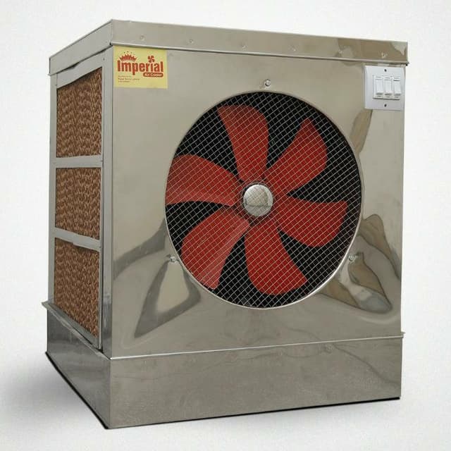 Body coated metal sheet, Size L60" x W36" H51", air flow 6000cfm, cover area 3000sqft, watt 750, amp 1.5, fan dia 24" cooper winding, sensor rely submersible pumps, 3 side imported cooling pad of 3" ideal for big halls,kitchens, factories and other residential areas.